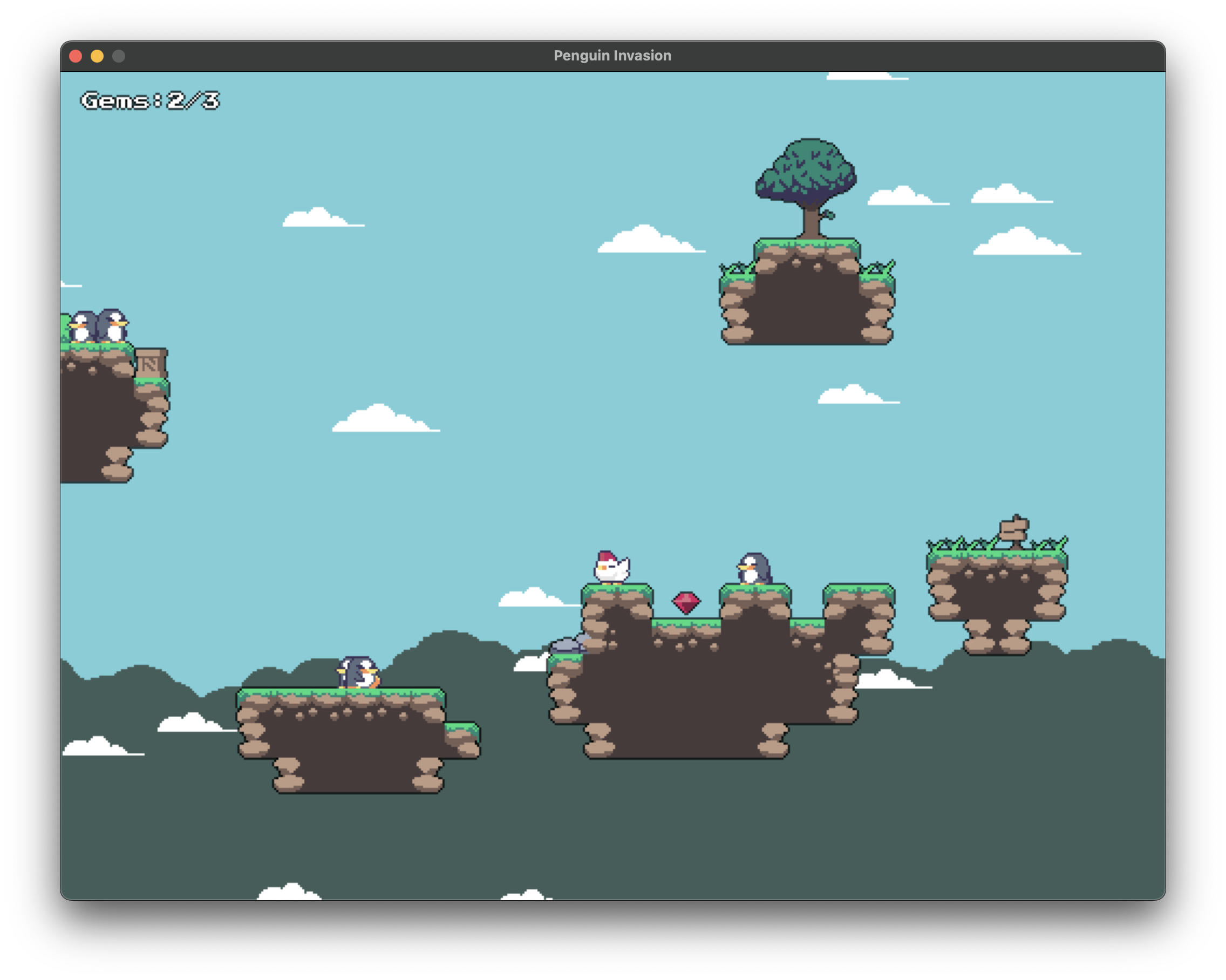 Penguin Invasion is a 2D platformer where you play as a chicken trying to avoid blind penguins that have invaded the Grassland, your home. Despite their blindness, these penguins possess a dangerous power: touching them causes an explosion! So, be cautious and navigate carefully. Your mission is to reach the Arctic to save the Frozen Shark, the only creature capable of defeating the penguins. You are the last hope for the animals of the Grassland!